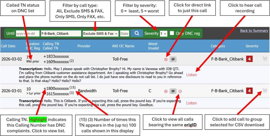 • DRILL-DOWN views show the individual calls associated with the counts in the summaries. For each call, it displays the date, first digits of called and calling number, attestation level (if signed), transcript and category. You can also click to hear the audio.