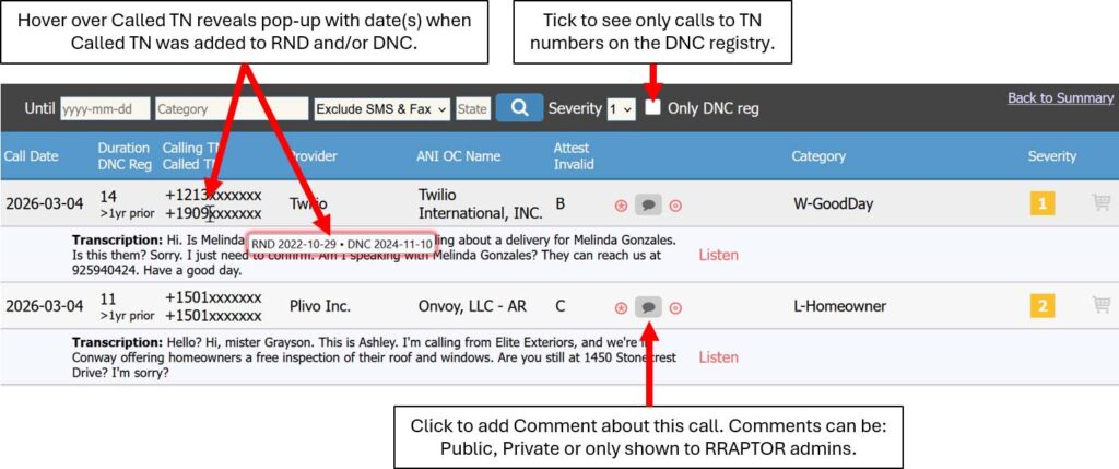 * Specifically, the FREE version displays redacted call details for the oldest 5 calls within the past 30 days (but you can sign up for instant daily notifications even beyond the 5). If RRAPTOR is only capturing a very small number of your calls, this is a great service for you. Signers of larger numbers of suspect calls will benefit from a paid subscription.